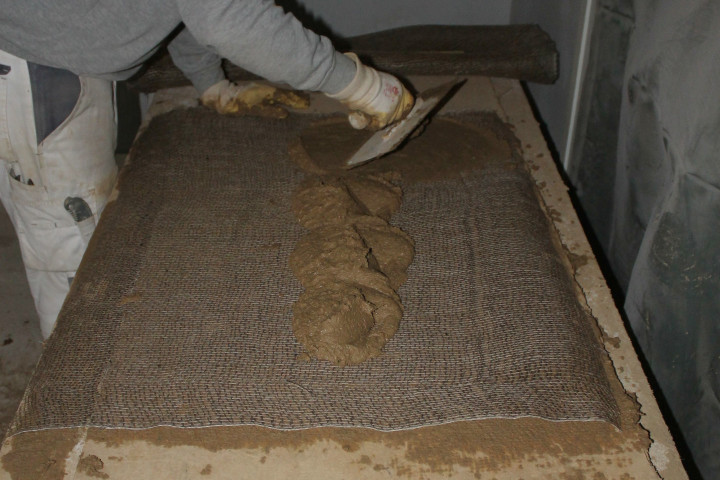 Ein Gewebe aus Jutefasern wird dabei dünn mit einem feuchten Lehm-Stroh-Gemisch eingestrichen. Mit diesem werden dann die alten hölzernen Staken der Decke umwickelt und Stück für Stück wieder zwischen die Balken der Decke eingesetzt. Die Zwischenräume der „Lehmwickel“ werden dann mit Lehm von oben und unten aufgefüllt und verstrichen. Nach einer Trocknungsphase ziehen die Fachleuchte dann in mehreren Schichten einen dünnen Lehmputz auf. Um die Decke insgesamt glatt verputzen zu können und für die erforderliche Haftung zu sorgen, werden zusätzlich Schilfrohrmatten angebracht.